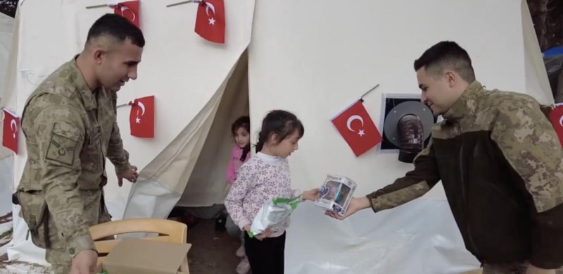 Kahramanmaraş merkezli depremlerin ardından vatandaşların her türlü ihtiyacına koşturan Mehmetçik, depremzede çocuklara oyuncak ve yiyecek dağıttı.