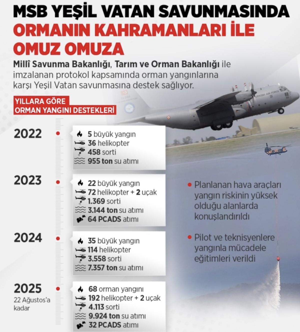 İletişim Başkanlığı'nın sosyal medya hesabından yayınlanan infografiğe göre, MSB'nin desteğiyle son dört yılda yüzlerce orman yangınına müdahale edildi.