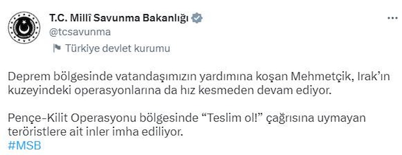Deprem bölgesinde vatandaşımızın yardımına koşan Mehmetçik, Irak'ın kuzeyindeki operasyonlarına da hız kesmeden devam ediyor. Pençe-Kilit Operasyonu bölgesinde 'teslim ol' çağrısına uymayan teröristlere ait inler imha ediliyor.