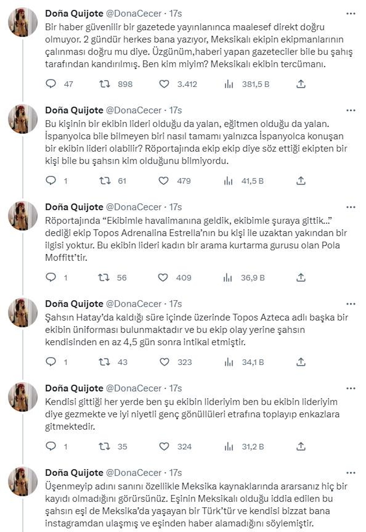 Röportajında “Ekibimle havalimanına geldik, ekibimle şuraya gittik…” dediği ekip Topos Adrenalina Estrella’nın bu kişi ile uzaktan yakından bir ilgisi yoktur. Bu ekibin lideri kadın bir arama kurtarma gurusu olan Pola Moffitt’tir.