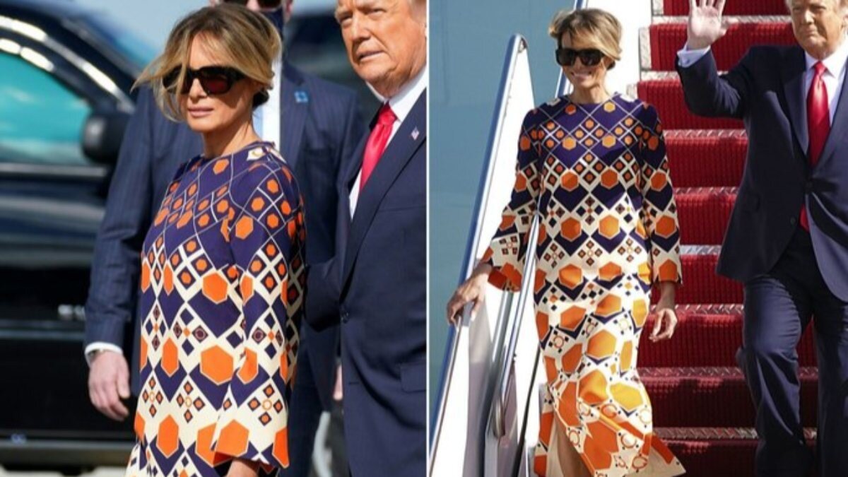 Siyahlar içerisinde bindiği uçaktan rengarenk inen Melania Trump’ın turuncu desenli 3 bin 700 dolarlık elbisesi (27 bin 417 TL), ‘karşıt’ olarak yorumlandı.