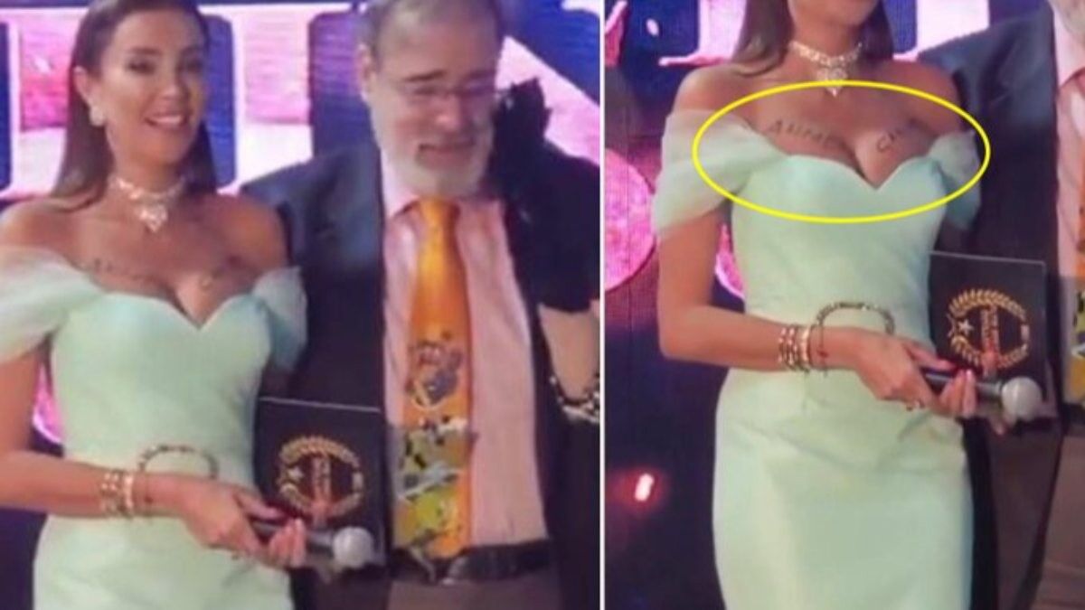 Seyhan Soylu, katıldığı ödül töreninde göğüs dekolteli bir elbise giyen Özge Ulusoy'un dekoltesine Ahmet Çakar'ın adını yazdı.