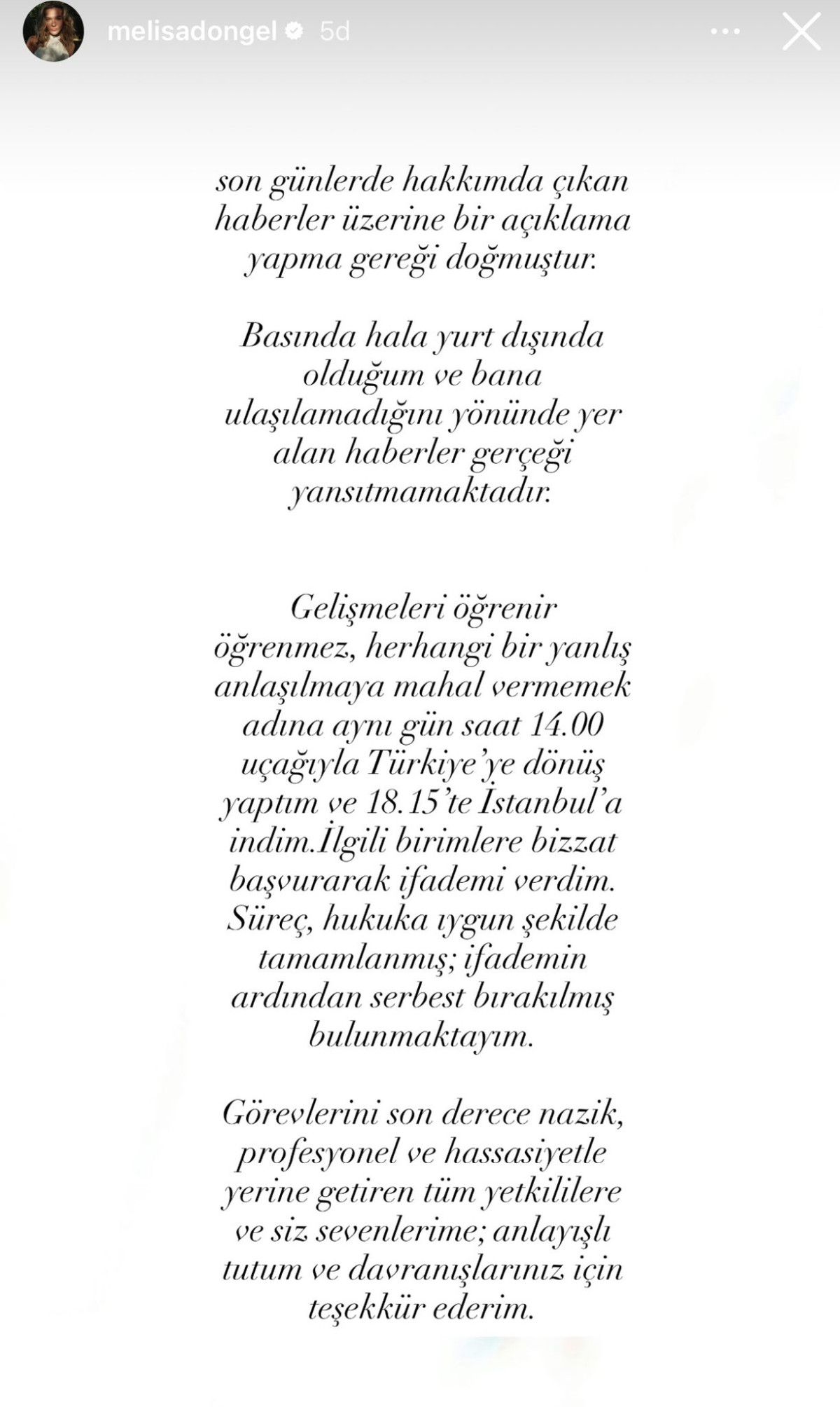 - Melisa Döngel, uyuşturucu soruşturmasında saç ve kan örneği verip serbest bırakıldı.