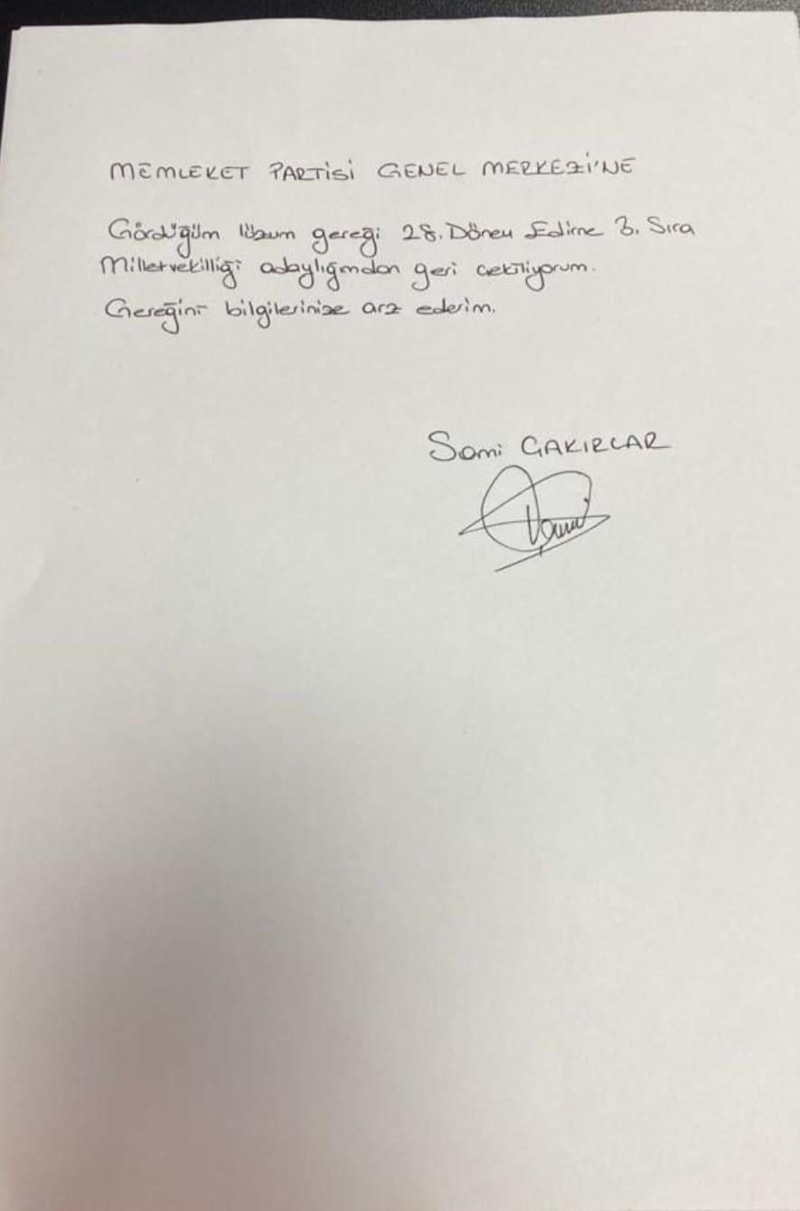 Aday, Bozkurt’un ardından 3. sıra adayı Sami Çakırlar da el yazısı ve imzası ile yazdığı, "Gördüğüm lüzum gereği 28. dönem Edirne 3. sıra milletvekilliği adaylığımdan geri çekiliyorum. Gereğini bilgilerinize arz ederim." ifadelerinin bulunduğu dilekçesini paylaştı.
