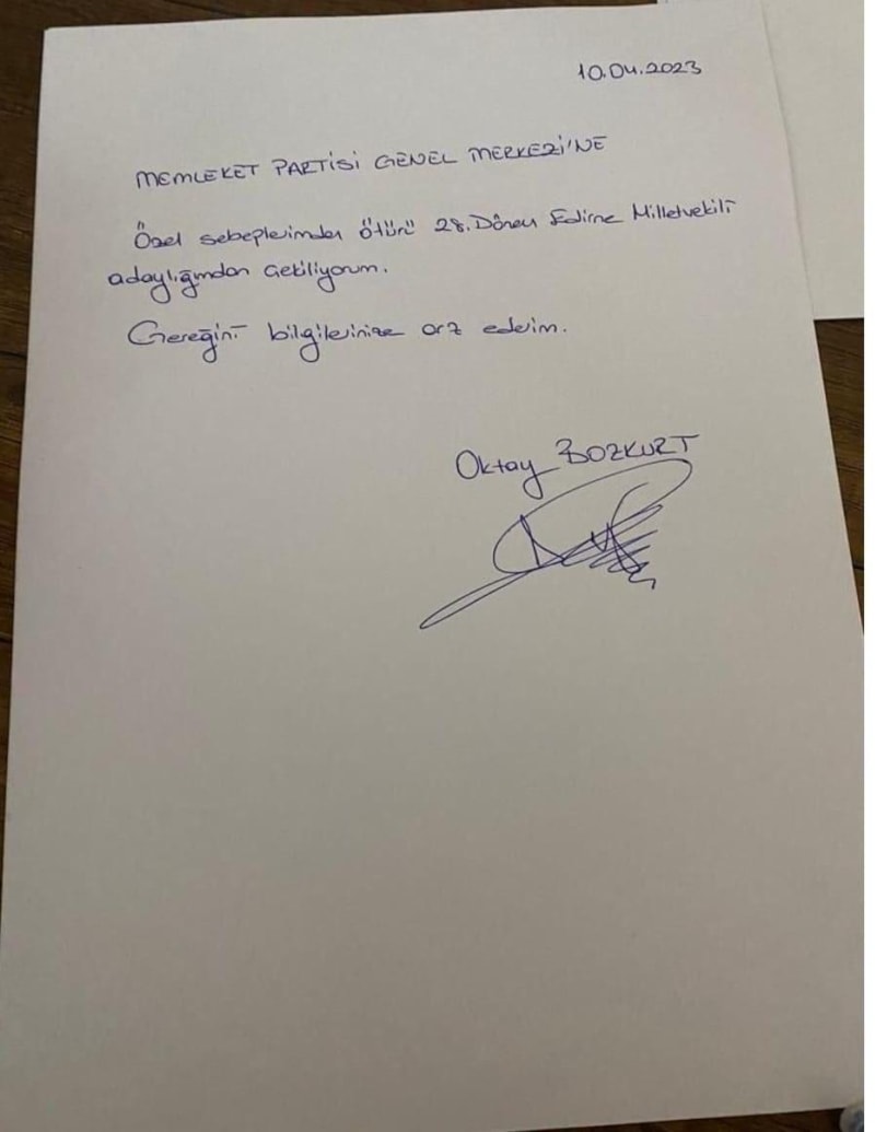 Memleket Partisi Edirne İl Başkanlığından istifa ederek milletvekili aday adayı olan ve 28. dönem Edirne 2. sıra milletvekili adayı listesinde yerini alan Bozkurt, "Memleket Partisi Genel Merkezi’ne, özel sebeplerimden dolayı 28. dönem Edirne milletvekili adaylığımdan çekiliyorum. Gereğinin bilgilerinize arz ederim" yazılı 10 Nisan 2023 tarihli bir dilekçeyi kendi el yazısı ve imzası ile hazırlayarak, partililerin yer aldığı WhatsApp grubuna gönderdi.
