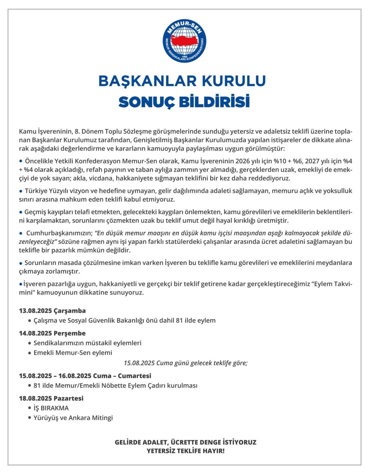 Memur-Sen Başkanlar Kurulu tarafından yayınlanan bildiride, hükümetin 2026 için yüzde 10 + yüzde 6 ve 2027 için yüzde 4 + yüzde 4'lük zam teklifinin "geçmiş kayıpları telafi etmekten, gelecekteki kaygıları önlemekten" çok uzak olduğu belirtildi.