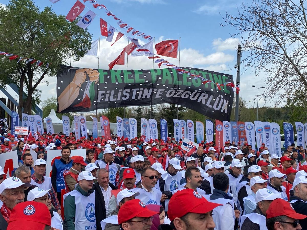 Krizlerin faturasının emekçiye kesilmemesi için, insan onuruna yaraşır bir çalışma hayatı için, güvenceli, kadrolu istihdam, adam gibi sendika yasası, doğru düzgün kamu personel sistemi, vergide adalet için buradayız. Bugün adil bölüşümü haykırmak, 'Dünya 5'ten, emek sermayeden büyüktür' demek için, barış, kardeşlik, birlik, beraberlik, emek ve ekmek için buradayız.