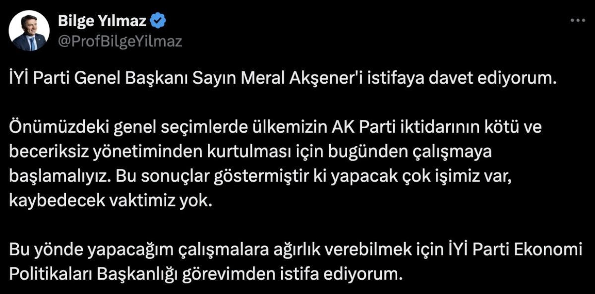 Bu sonuçlar göstermiştir ki yapacak çok işimiz var, kaybedecek vaktimiz yok. Bu yönde yapacağım çalışmalara ağırlık verebilmek için İYİ Parti Ekonomi Politikaları Başkanlığı görevimden istifa ediyorum.