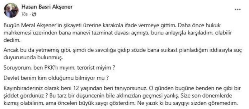 Suç duyurusunun içeriğinde, İzmit'te yaşayan kayınbiraderi Hasan Basri Akşener'in kendisi hakkında yaptığı paylaşımlar ve Meral Akşener ile sık sık görüşen S.K. ile sosyal medya hesabı üzerinden yapılan görüşmeler yer aldı.