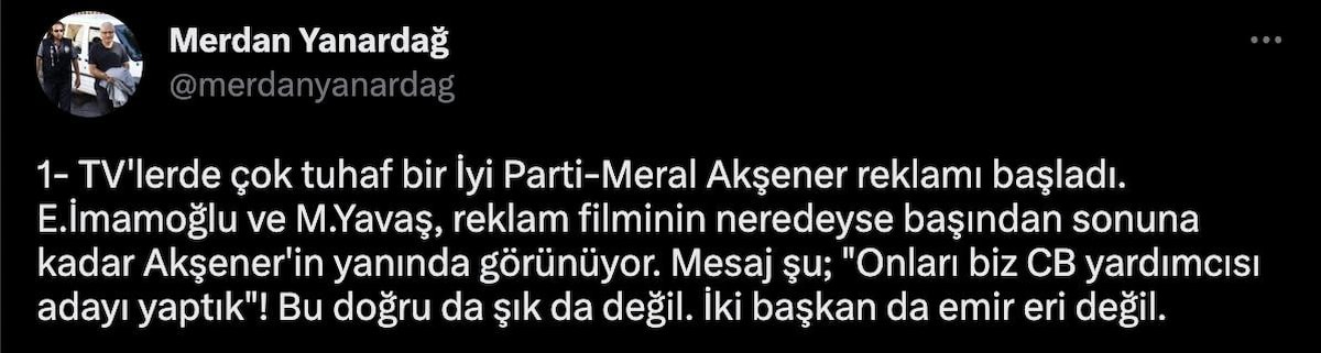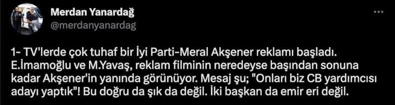 "1- TV'lerde çok tuhaf bir İyi Parti-Meral Akşener reklamı başladı. E.İmamoğlu ve M.Yavaş, reklam filminin neredeyse başından sonuna kadar Akşener'in yanında görünüyor. Mesaj şu; "Onları biz CB yardımcısı adayı yaptık"! Bu doğru da şık da değil. İki başkan da emir eri değil.
