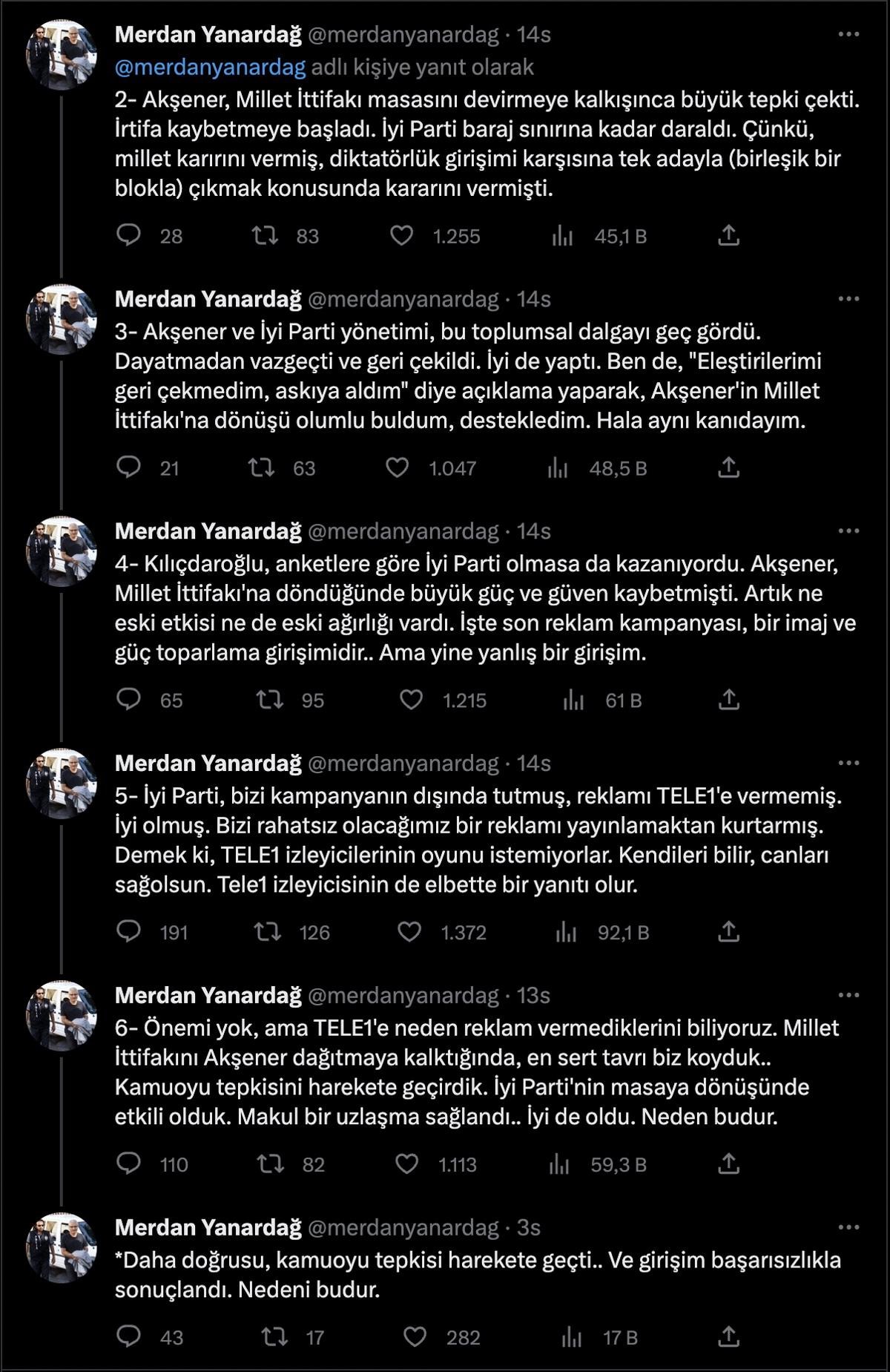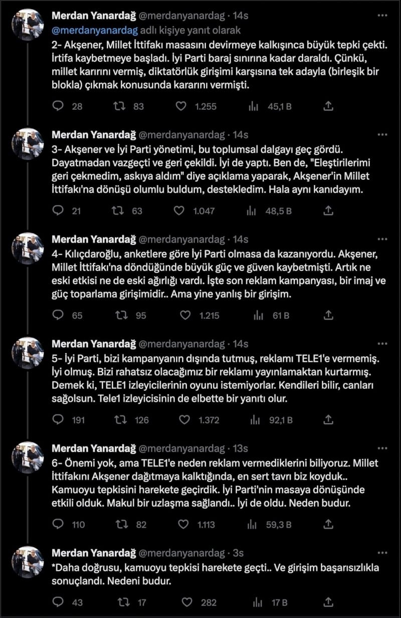 6- Önemi yok, ama TELE1'e neden reklam vermediklerini biliyoruz. Millet İttifakını Akşener dağıtmaya kalktığında, en sert tavrı biz koyduk.. Kamuoyu tepkisini harekete geçirdik. İyi Parti'nin masaya dönüşünde etkili olduk. Makul bir uzlaşma sağlandı.. İyi de oldu. Neden budur.
