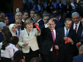 Başbakan Ahmet Davutoğlu, Almanya Başbakanı Angela Merkel, AB Konseyi Başkanı Donald Tusk ve AB Komisyonu Birinci Başkan Yardımcısı Frans Timmermans, Gaziantep'te Nizip-2 Konteyner Kent ve Konaklama Tesisi'nde Suriyeli sığınmacılarla bir araya geldi