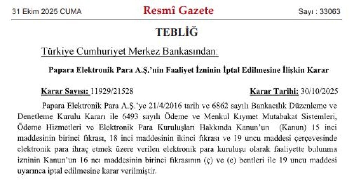 Türkiye Cumhuriyet Merkez Bankası, Papara Elektronik Para A.Ş.'nin faaliyet iznini iptal etti. Karar, 31 Ekim 2025 tarihli Resmi Gazete’de yayımlandı.