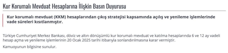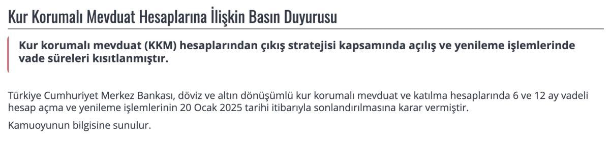 Türkiye Cumhuriyet Merkez Bankası, döviz ve altın dönüşümlü kur korumalı mevduat ve katılma hesaplarında 6 ve 12 ay vadeli hesap açma ve yenileme işlemlerinin 20 Ocak 2025 tarihi itibarıyla sonlandırılmasına karar vermiştir.