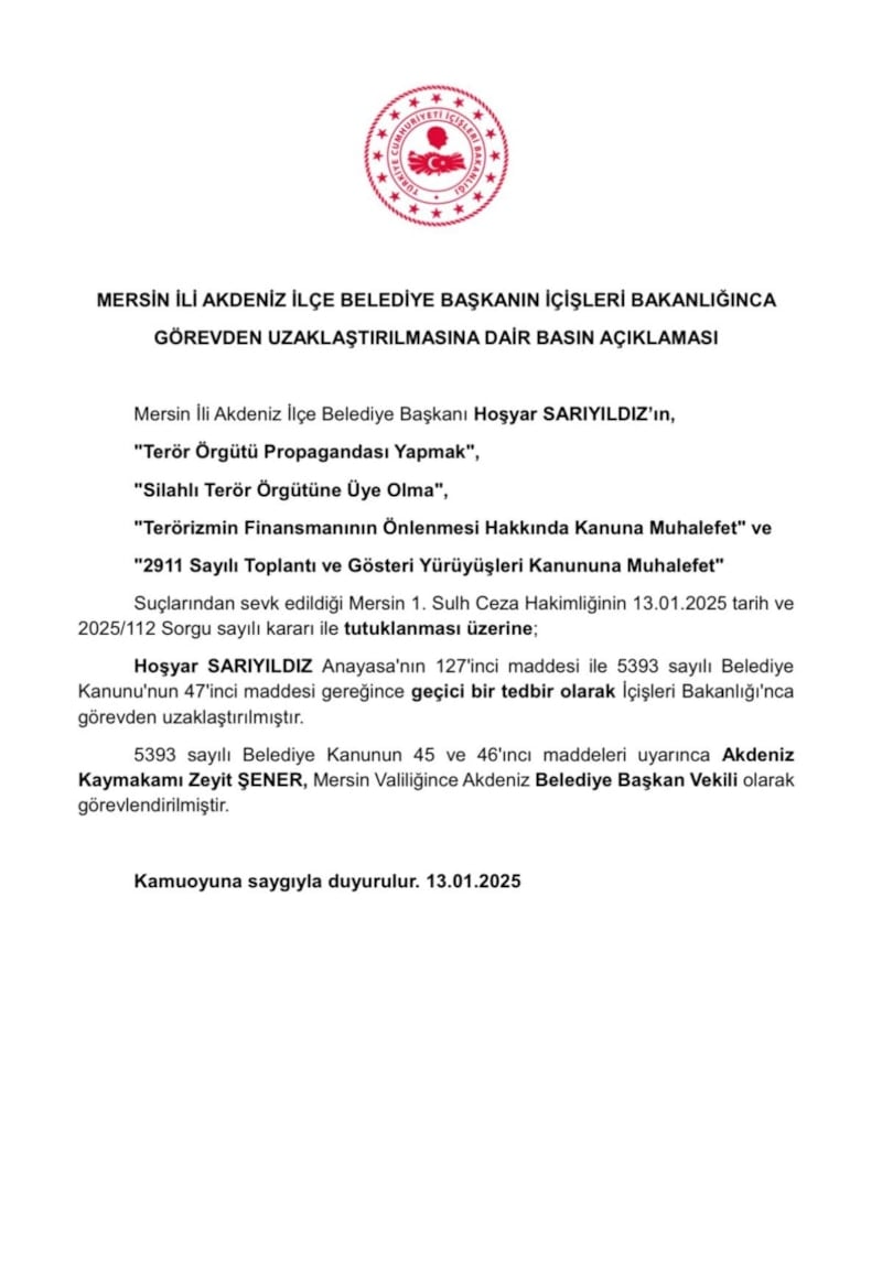İçişleri Bakanlığı tarafından, Hoşyar Sarıyıldız'ın yerine Akdeniz Kaymakamı Seyit Şener'in belediye başkan vekili olarak atandığı duyuruldu.