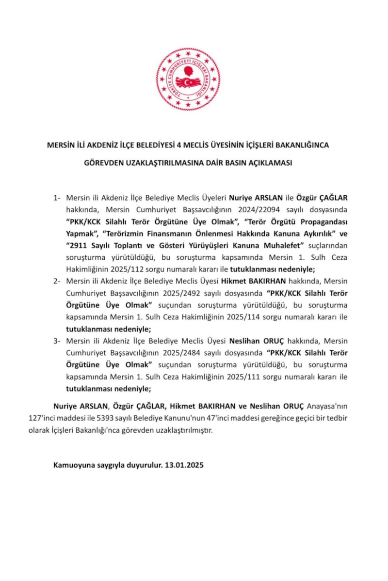 Bu kapsamda da Mersin Cumhuriyet Başsavcılığı tarafından yürütülen terör soruşturmasında DEM Parti Akdeniz Belediye Başkanı Hoşyar Sarıyıldız, yardımcısı Nuriye Arslan ile meclis üyeleri Özgür Çağlar, Neslihan Oruç, Yakup Danış ve Hikmet Bakırhan, 'terör örgütü propagandası yapmak’, ‘silahlı terör örgütüne üye olmak’, ‘terörizmin finansmanının önlenmesi hakkında kanuna aykırılık’, ‘2911 sayılı toplantı ve gösteri yürüyüşleri kanununa muhalefet’ suçlarından, geçtiğimiz hafta gözaltına alındı.