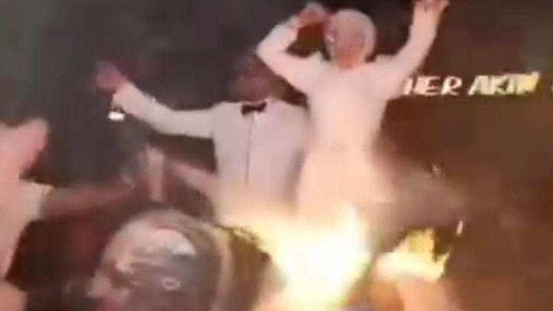 Gelin ve damat pistte dans ederken düzenlenen köpüklü ve meşaleli eğlence sırasında konuklardan birinin başına istenmeyen bir olay geldi.