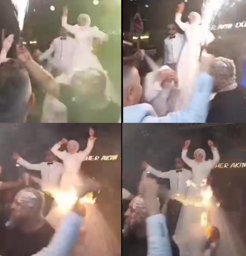 Eğlence için kullanılan köpüklerin sıkıldığı bir anda, elinde meşale tutan başka bir kişinin kıvılcımlarından biri, seyirciler arasında yer alan birinin saçına sıçradı.