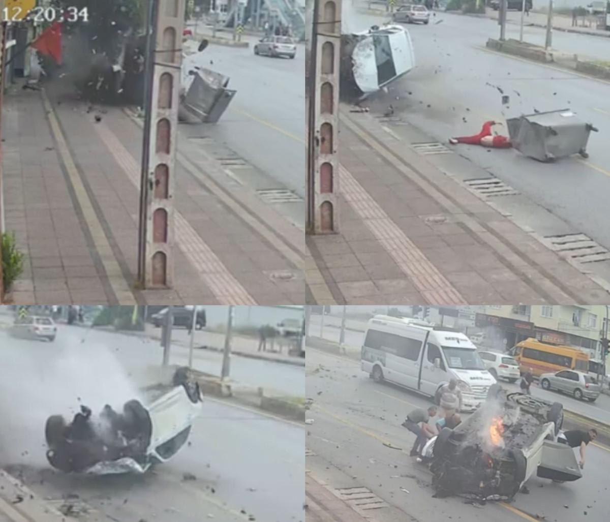 Bir iş yerinin güvenlik kamerasına yansıya görüntülerde, ışık ihlali yapan otomobilin kavşaktan dönen başka bir araca çarpmamak için ani haraket yapması sonucu yoldan çıkarak yayalara ve ağaca çarpıp ters döndüğü anlar yer aldı.