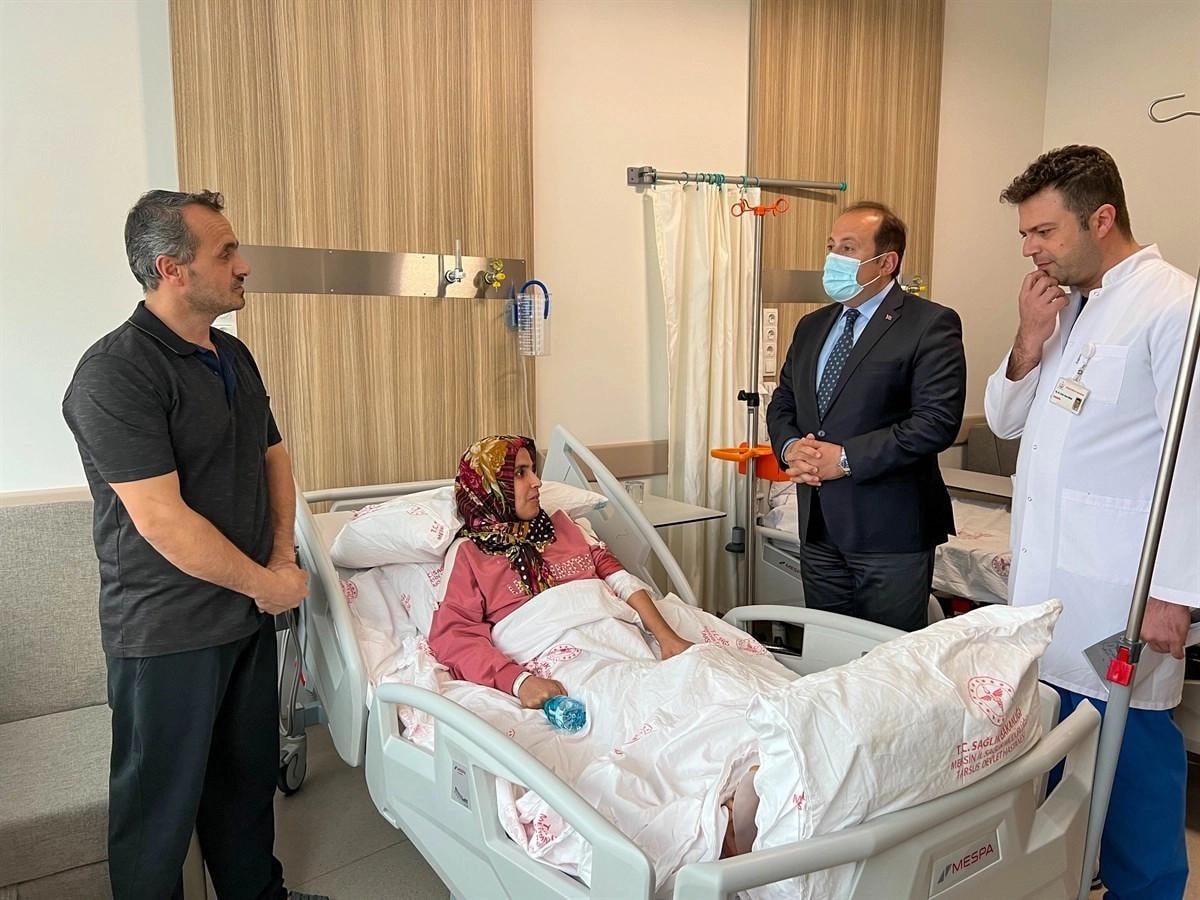 Yaralı afetzedelerle görüşüp "geçmiş olsun" dileklerini ileten Pehlivan, Başhekim Opr. Dr. Sadık Emre Direk'ten tedavi süreçlerine ilişkin bilgi aldı.