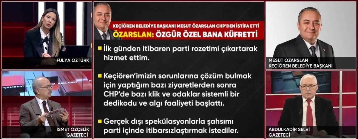 Açıklamasından bir süre sonra CNN TÜRK'te Fulya Öztürk'ün sunduğu canlı yayın programına bağlanan Keçiören Belediye Başkanı Mesut Özarslan, yaşananlara ilişkin burada gazetecilerin sorularını yanıtladı.