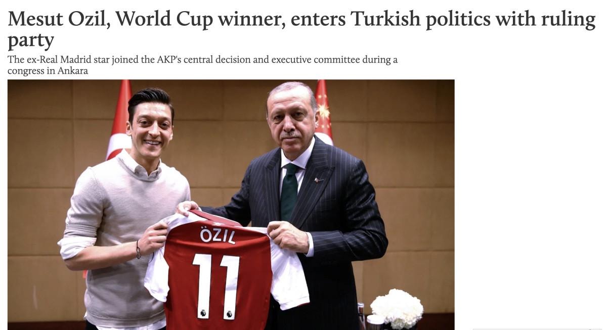 Haberde, "Almanya Milli Takımı ile Dünya Kupası şampiyonluğu yaşayan futbolcu Mesut Özil, Türkiye siyasetine iktidar partisinde üst düzey karar vericilerden biri olarak adım attı.