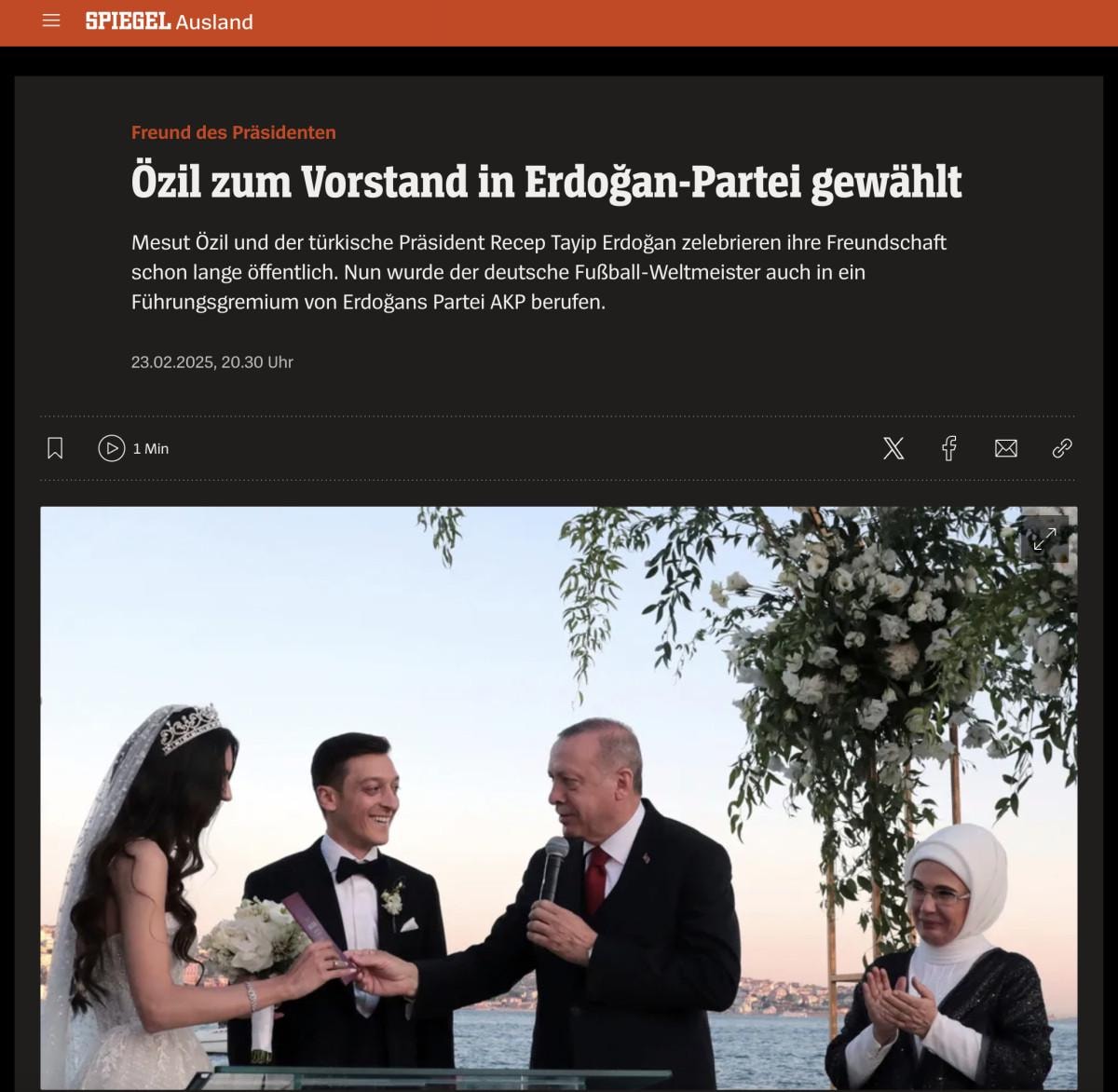 Almanya merkezli önemli yayın organlarının başında gelen Der Spiegel haberi "Özil, Erdoğan'ın partisinin yönetim kuruluna seçildi." başlığıyla verdi.