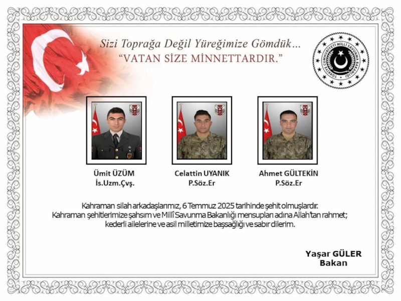Milli Savunma Bakanlığı, 2022 yılında şehit düşen Piyade Üsteğmen Nuri Melih Bozkurt’un naaşını bulmak amacıyla yürütülen arama-tarama faaliyetleri sırasında metan gazından zehirlenen ve kaldırıldıkları hastanede şehit düşen 3 askerin kimliklerini açıkladı.