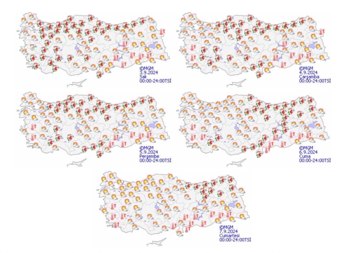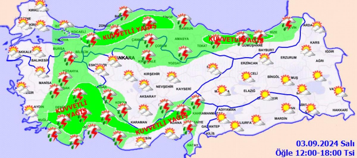 Yağışların; Hatay, Afyonkarahisar, Sakarya çevreleri, Muğla, Ordu, Giresun, Rize ve Trabzon'un iç kesimlerinin yerel olarak kuvvetli olması bekleniyor.