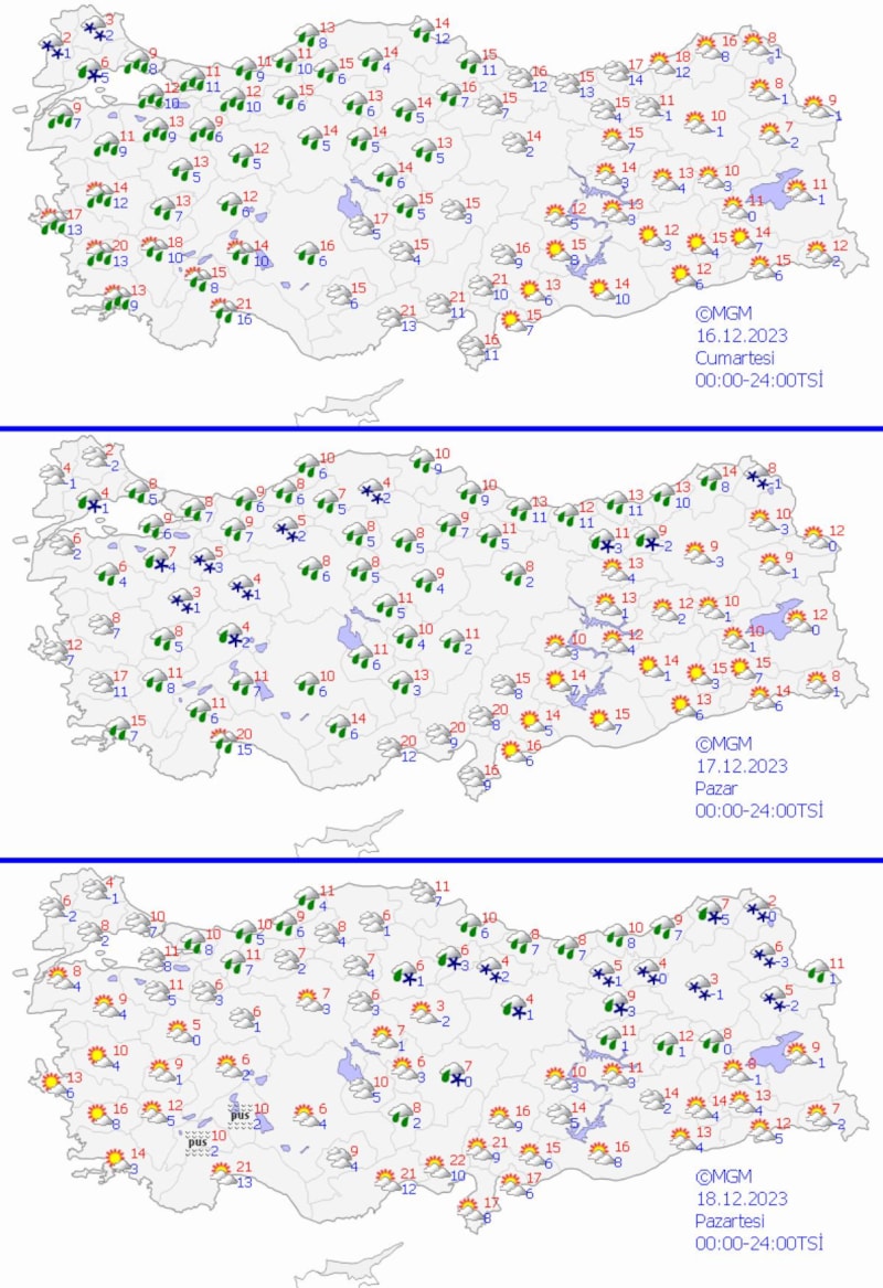 Hafta sonuna ilişkin değerlendirmede ise "Genellikle mevsim normalleri üzerinde seyreden hava sıcaklıklarının cumartesi gününden itibaren kuzeybatı kesimlerden başlayarak kuzey, iç ve batı kesimlerde hissedilir derecede azalacağı ve mevsim normalleri civarına, hafta başından itibaren kuzeybatı kesimlerde yer yer mevsim normalleri altına düşeceği tahmin ediliyor" denildi.