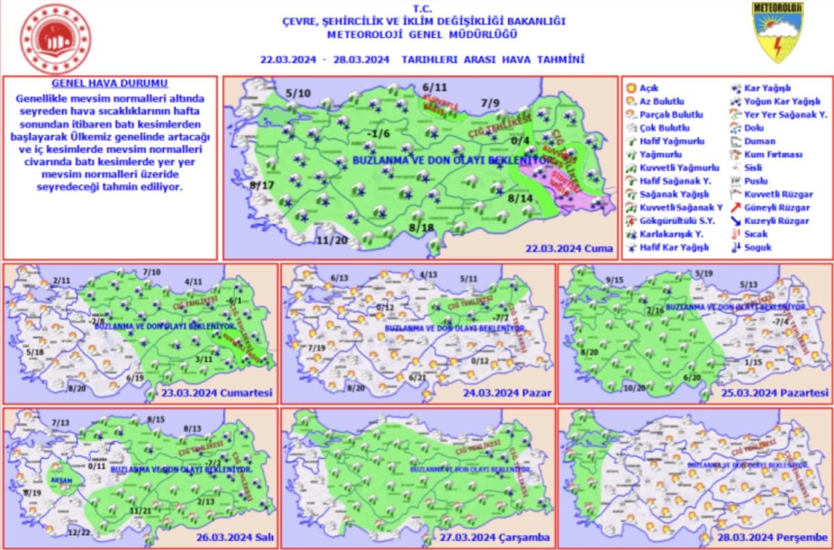 Genellikle mevsim normalleri altında seyreden hava sıcaklıklarının hafta sonundan itibaren batı kesimlerden başlayarak ülke genelinde artacağı ve iç kesimlerde mevsim normalleri civarında batı kesimlerde yer yer mevsim normalleri üzerinde seyredeceği tahmin ediliyor.