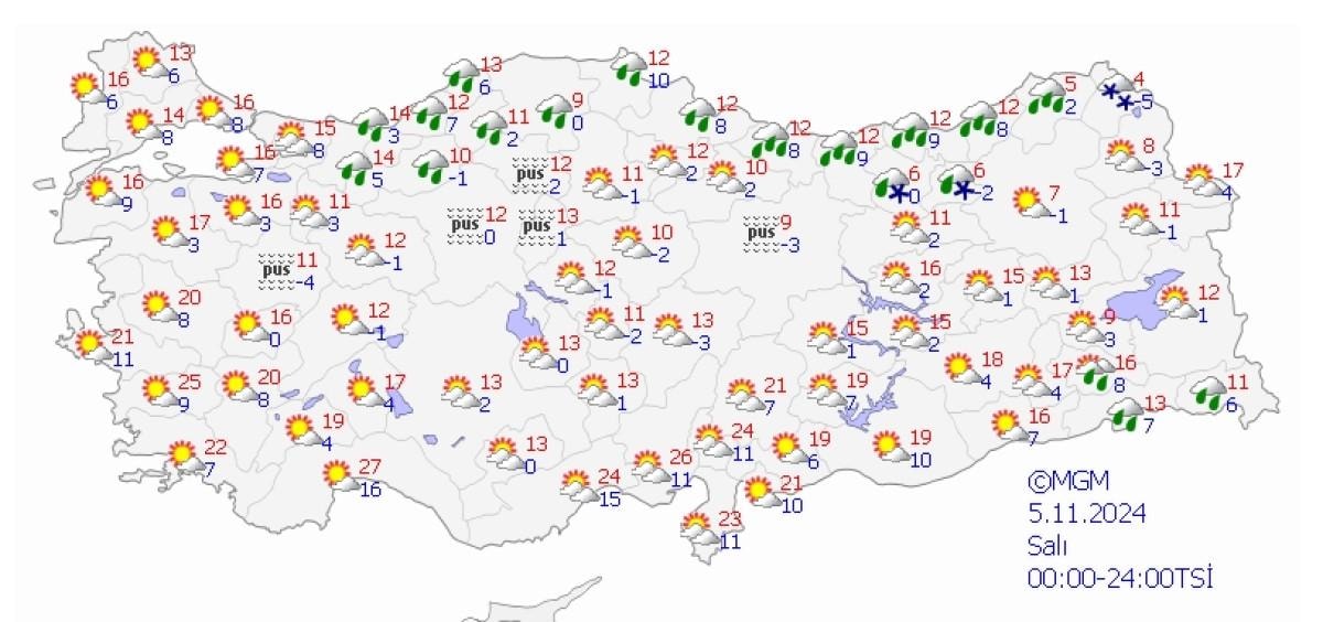 Bugün, yurdun kuzey kesimleri ve Karadeniz Bölgesi'nde yağışlı havanın hakim olacağını dile getiren Özdemirci, "Sakarya, Ardahan, Hakkari ve Şırnak'ta aralıklı yağışlar var. Özellikle Batı ve Doğu Karadeniz'in iç kesimleri ve Ardahan, Hakkari'nin yüksek bölgelerinde karla karışık yağmur ve kar yağışı göreceğiz." diye konuştu.