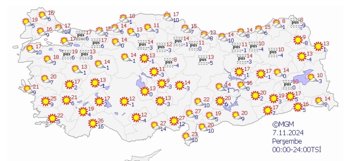 Ankara'da da az bulutlu havanın hakim olacağını, yağış beklenmediğini belirten Özdemirci, "Bugün ve çarşamba günü özellikle gece ve sabah saatlerinde yer yer pus hadisesi görülecek. Bugün gece 0, gündüz 12, çarşamba günü gece eksi 1, gündüz 12, perşembe günü eksi 1, gündüz 13 derece sıcaklık bekliyoruz." diye konuştu.