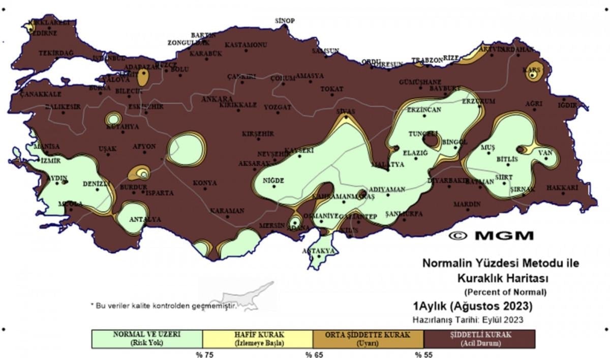 Meteoroloji'nin ağustos ayına yönelik Normalin Yüzdesi Metodu'na (PNI- Percent of Normal Index) göre hazırlanan meteorolojik kuraklık durumunu gösteren Türkiye haritasında ise Marmara Bölgesi, Karadeniz'in neredeyse tamamı, diğer bölgelerin de büyük kısmı için 'şiddetli kurak (acil durum)' olarak yer verildi.