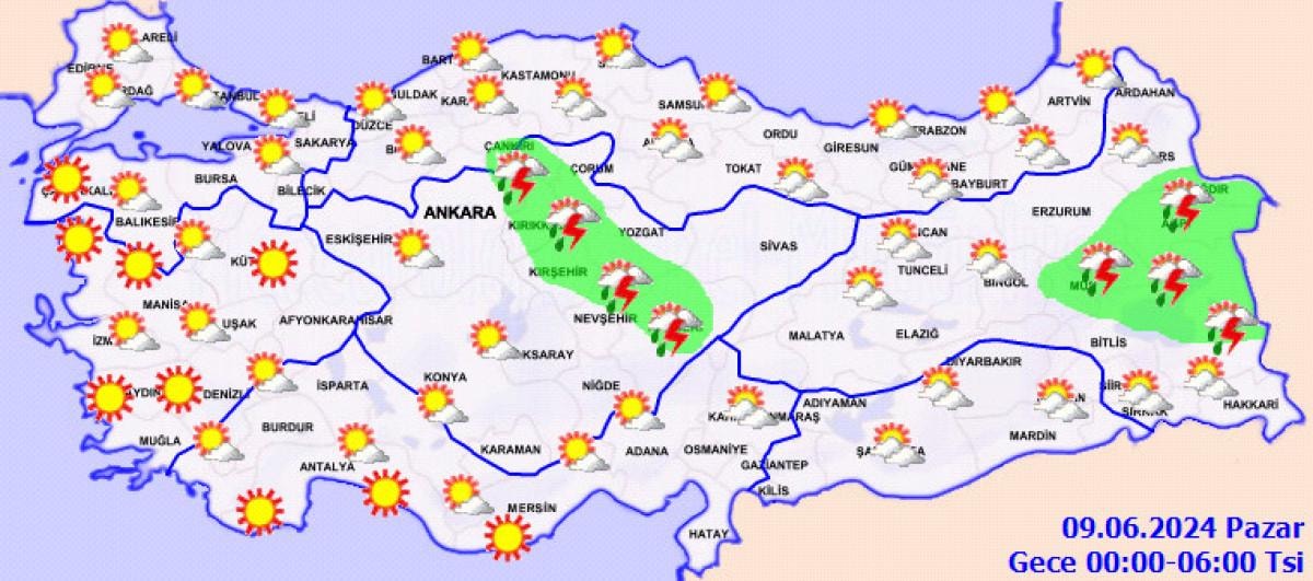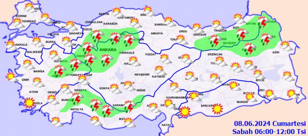 Meteoroloji Genel Müdürlüğü tarafından yapılan son değerlendirmelere göre, İç Ege, Akdeniz'in iç kesimleri, İç Anadolu, Batı ve Orta Karadeniz'in iç kesimleri, Doğu Karadeniz, Doğu Anadolu ile Diyarbakır çevrelerinin yerel sağanak ve gök gürültülü sağanak yağışlı geçeceği tahmin ediliyor.