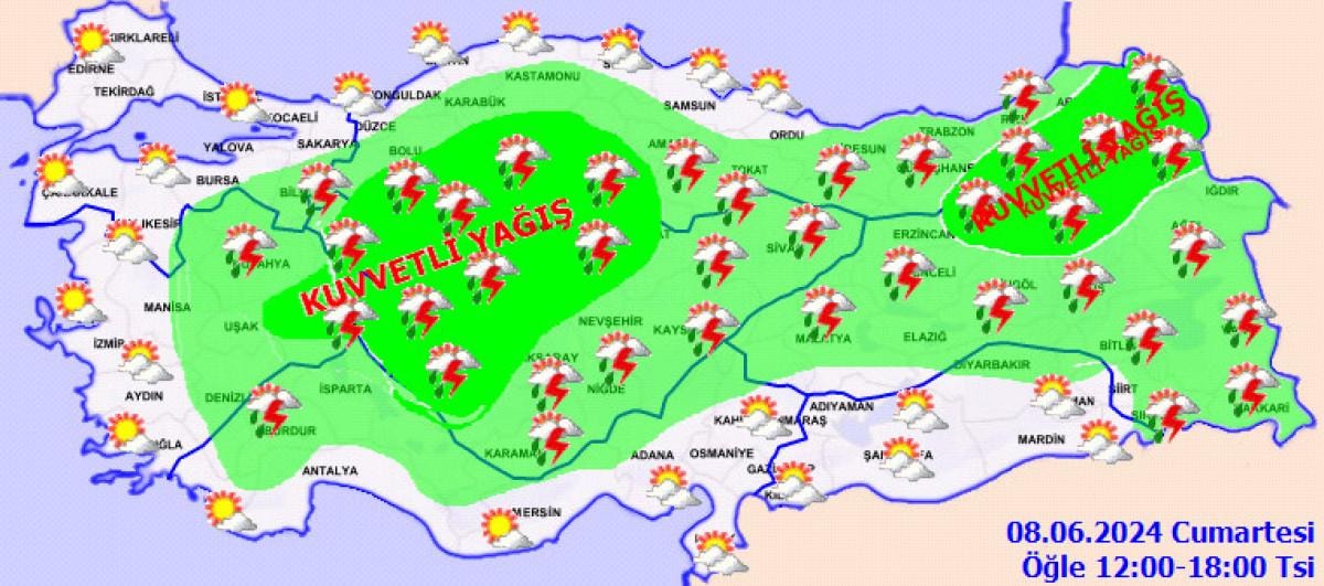 Yağışların Ankara, Eskişehir, Çankırı, Kırıkkale, Kırşehir, Yozgat, Afyonkarahisar, Konya, Çorum, Bolu’nun güney ve doğusu,, Karabük'ün güney kesimleri, Erzurum, Kars, Ardahan, Ağrı ve Bayburt çevreleri ile Rize ve Artvin illerinin iç kesimlerinde yerel olmak üzere kuvvetli olması bekleniyor.