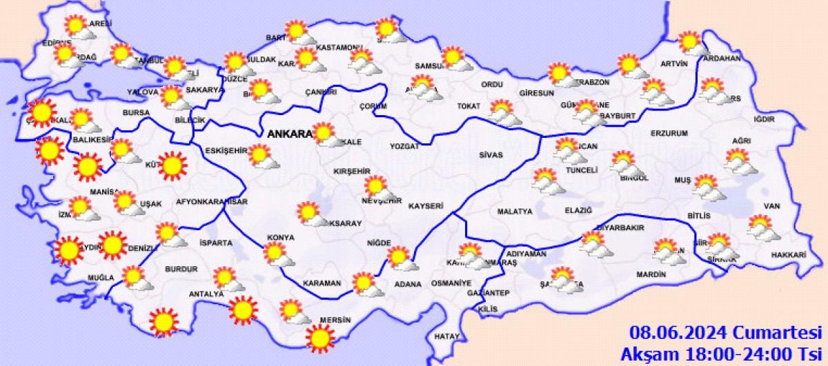 Meteoroloji, 8 Haziran 2024 Cumartesi gününe ilişkin hava tahmin raporunu açıkladı. Gök gürültülü kuvvetli sağanak beklenen 18 il için sarı kodlu uyarı yapıldı. Öte yandan yurt genelinde ise mevsim normalleri üzerinde seyreden sıcaklıklar etkili olmaya devam edecek.