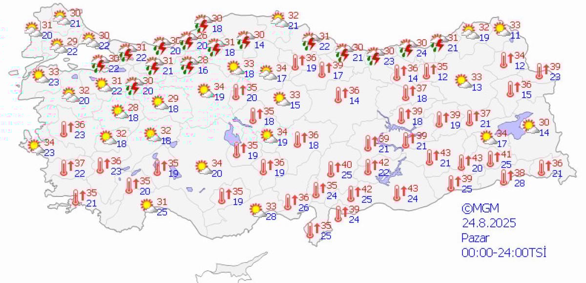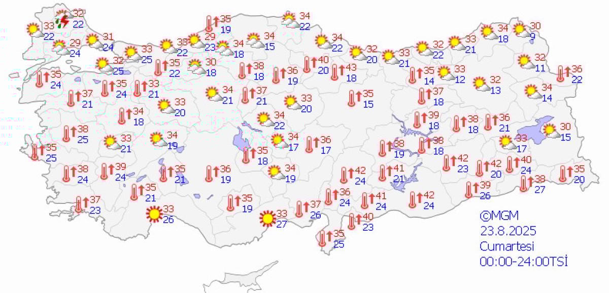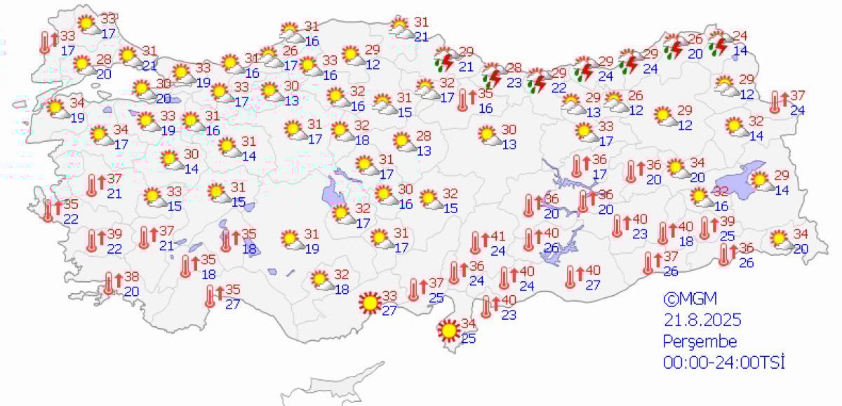 Meteoroloji Genel Müdürlüğü'nün açıklamasına göre perşembe günü hava sıcaklıkları iç ve doğu bölgelerde mevsim normalleri üzerinde, diğer yerlerde mevsim normalleri civarında seyredecek.