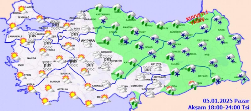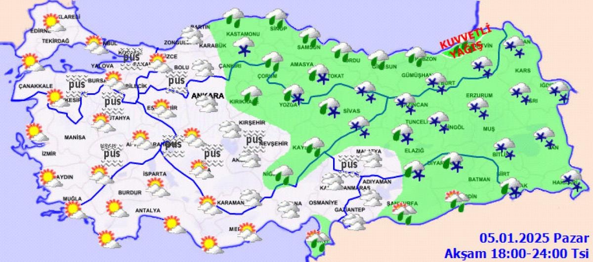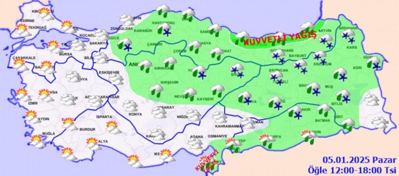 Meteoroloji’nin verilerine göre; yağışların, Orta ve Doğu Karadeniz kıyıları, Amasya ve Tokat çevreleri ile Hatay'ın güney kıyılarında kuvvetli olmak üzere genellikle yağmur ve sağanak, İç Anadolu’nun kuzeydoğusu, Karadeniz’in iç kesimleri, Doğu Anadolu ile Güneydoğu Anadolu’nun kuzeydoğusunda karla karışık yağmur ve kar şeklinde olması bekleniyor.