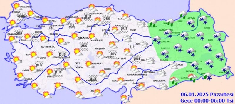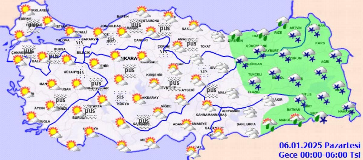 Yurdun iç ve doğu kesimlerinde buzlanma ve don olayı ile birlikte pus ve yer yer sis görüleceği tahmin ediliyor. Doğu Karadeniz’in iç kesimlerinin yüksekleri ile Doğu Anadolu’nun yüksek ve dik yamaçlarında çığ tehlikesi bulunuyor.