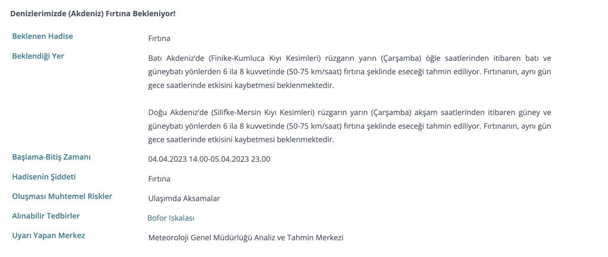 Batı Akdeniz’de (Finike-Kumluca Kıyı Kesimleri) rüzgarın yarın (Çarşamba) öğle saatlerinden itibaren batı ve güneybatı yönlerden 6 ila 8 kuvvetinde (50-75 km/saat) fırtına şeklinde eseceği tahmin ediliyor.