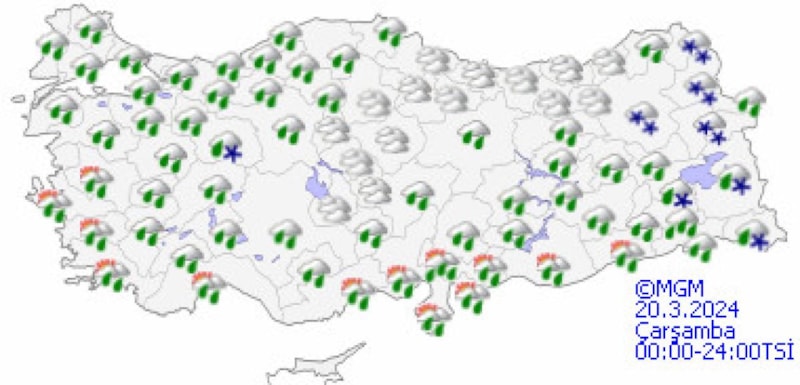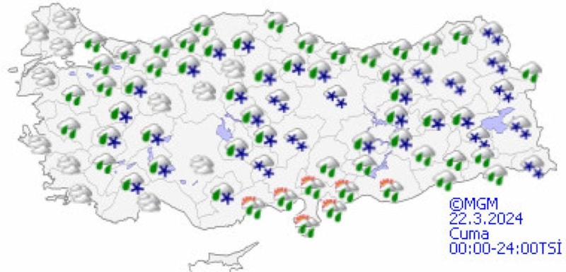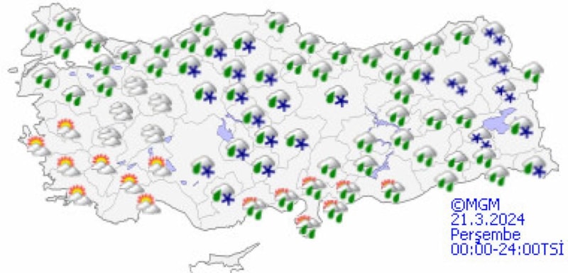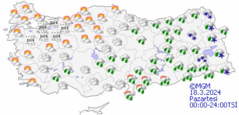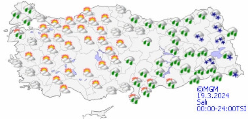 Yurdun güneydoğu kesimlerinde kuvvetli olması beklenen yağışların genellikle yağmur ve sağanak, Doğu Karadeniz'in iç kesimleri ile Doğu Anadolu'nun kuzey ve doğusunun karla karışık yağmur ve kar yağışı şeklinde görüleceği tahmin ediliyor.