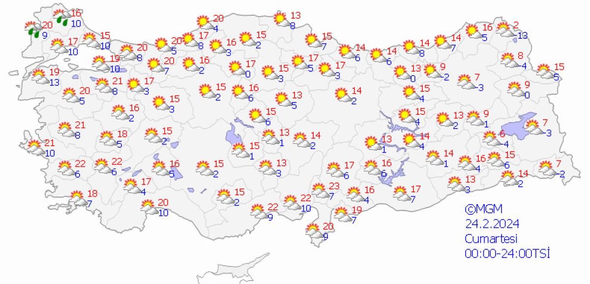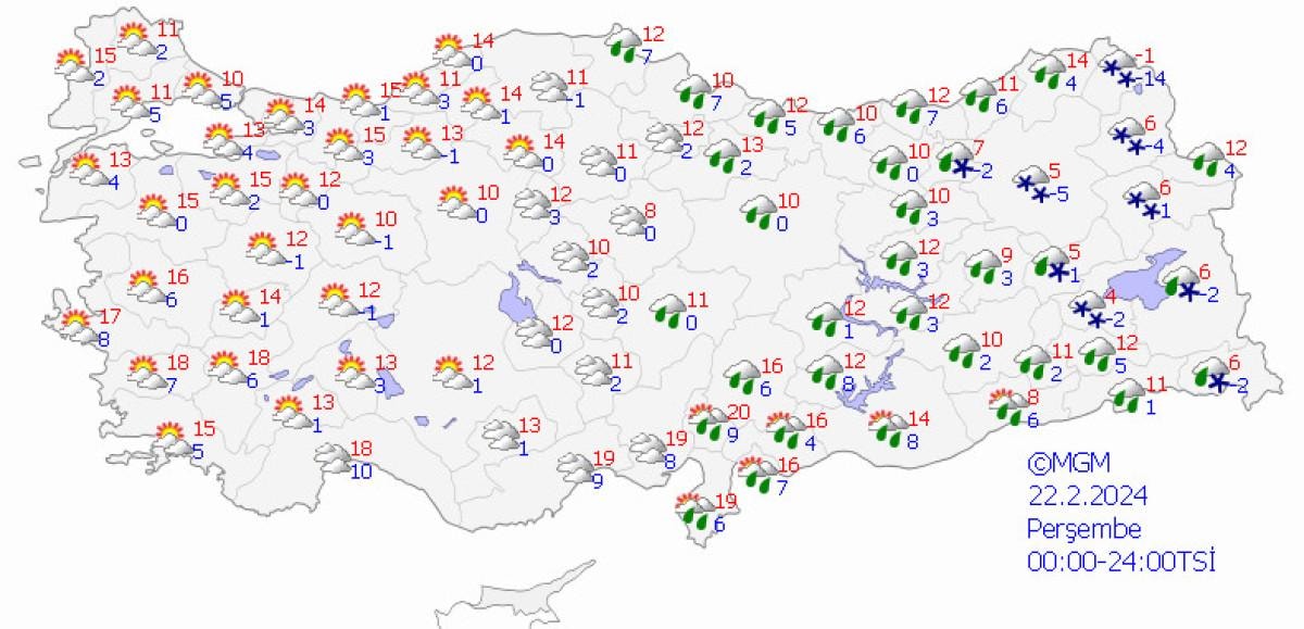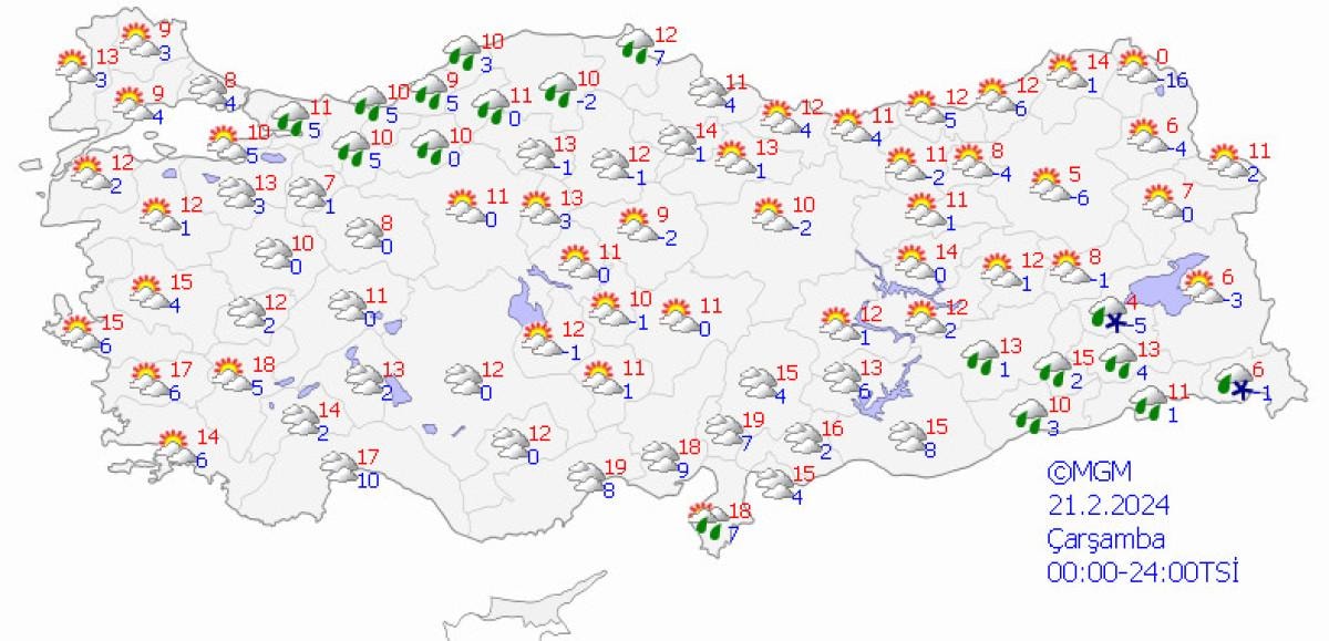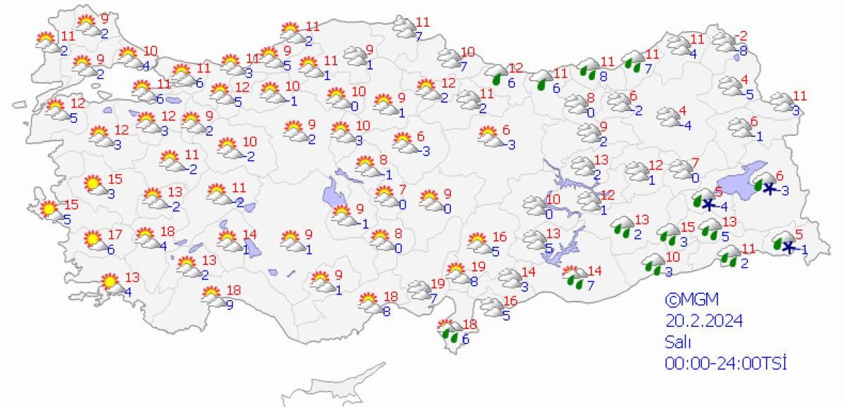 Yetkililerin tahminlere göre; ülkemizin kuzey ve doğusunun parçalı ve yer yer çok bulutlu, Doğu Karadeniz kıyıları, Doğu Anadolu'nun güneydoğusu, Güneydoğu Anadolu'nun doğusu, Hatay, Şanlıurfa, Artvin ile ilk saatlerde Adana, Elazığ ve Tunceli çevrelerinin yağışlı, diğer yerlerin az bulutlu geçeceği tahmin ediliyor.