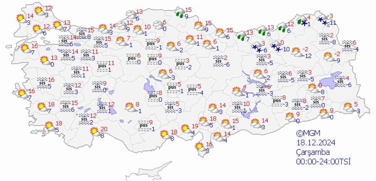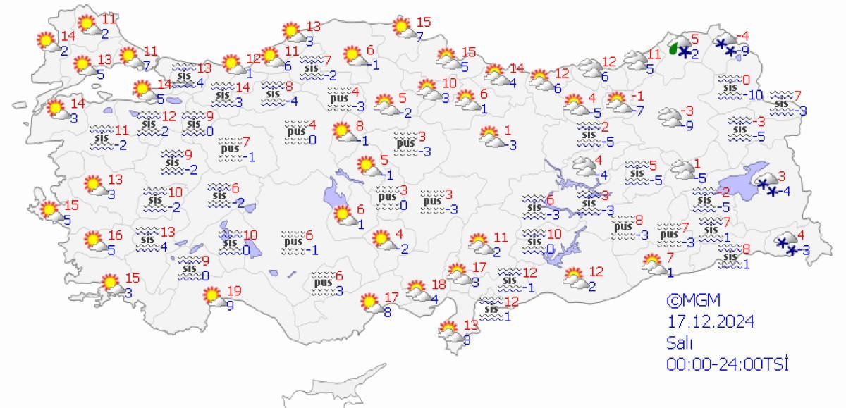 İç ve doğu kesimlerde buzlanma ve don olaylarına ek olarak pus ve yer yer sis oluşacak.