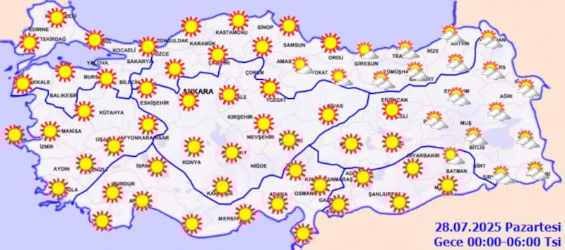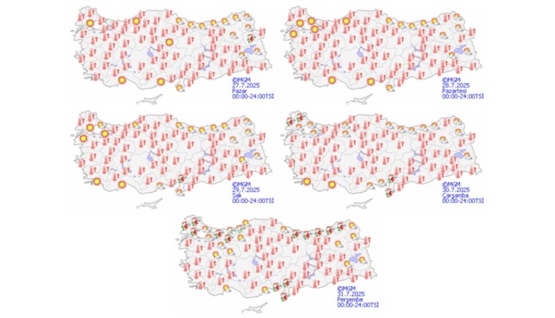 Meteoroloji Genel Müdürlüğü'nün (MGM) 27 Temmuz-2 Ağustos 2025 tarihlerini kapsayan hava tahmin raporuna göre, Türkiye genelinde etkili olan sıcak hava dalgası yeni haftada da sürecek.