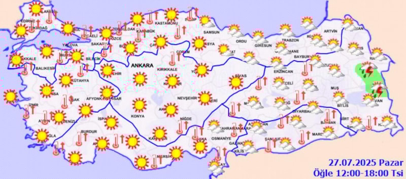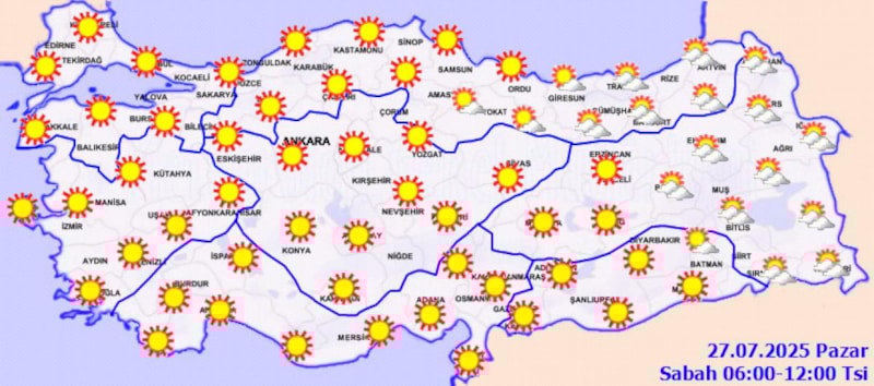 Meteoroloji Genel Müdürlüğü'nün haftalık hava durumu raporuna göre, Türkiye genelinde sıcak hava etkisini sürdürecek. Meteoroloji ayrıca 27 Temmuz Pazar gününün hava durumunu da paylaştı.