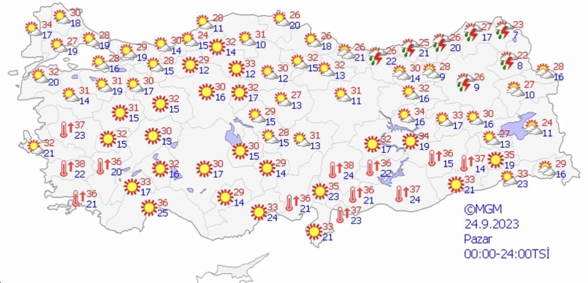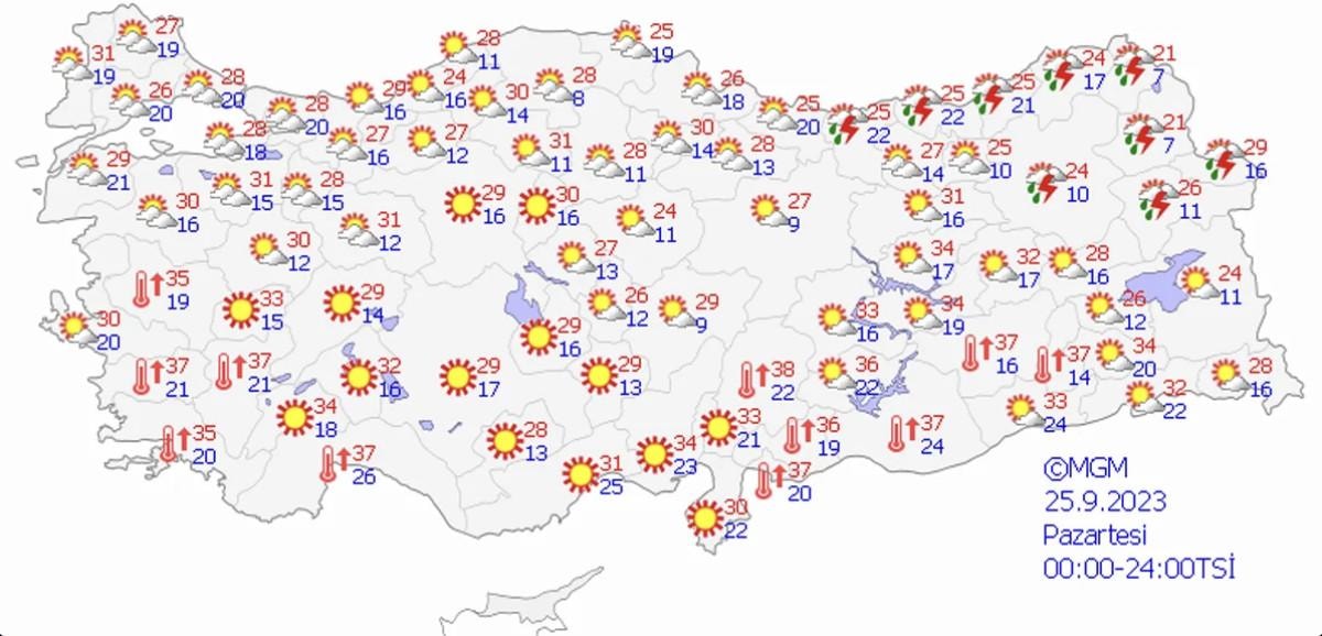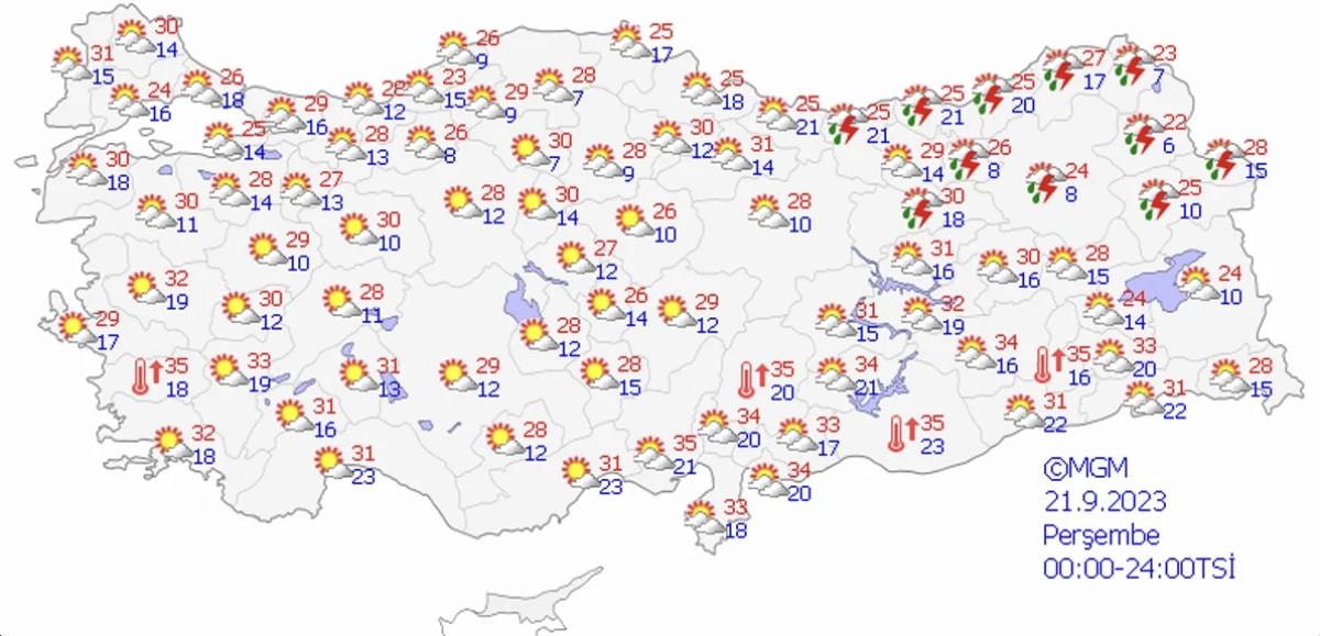 Doğu Karadeniz, Erzurum, Erzincan, Iğdır, Ağrı, Kars, Ardahan çevreleri, Van’ın güney kesimleri ile bu akşam saatlerinde Sivas, Kahramanmaraş, Kayseri’nin doğusu, Osmaniye’nin doğusu, Malatya, Adıyaman, Şanlıurfa çevreleri ve Gaziantep’in doğu kesimlerinin yerel sağanak ve gök gürültülü sağanak yağışlı, diğer yerlerin az bulutlu ve açık geçeceği tahmin ediliyor.