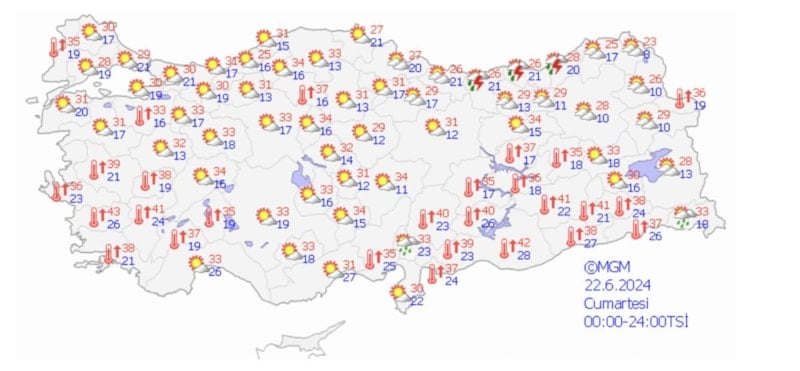 Adana 39, Hatay 38, Kahramanmaraş 42, Isparta 37 derece. Mersin'de hissedilen sıcaklık 39 derece.