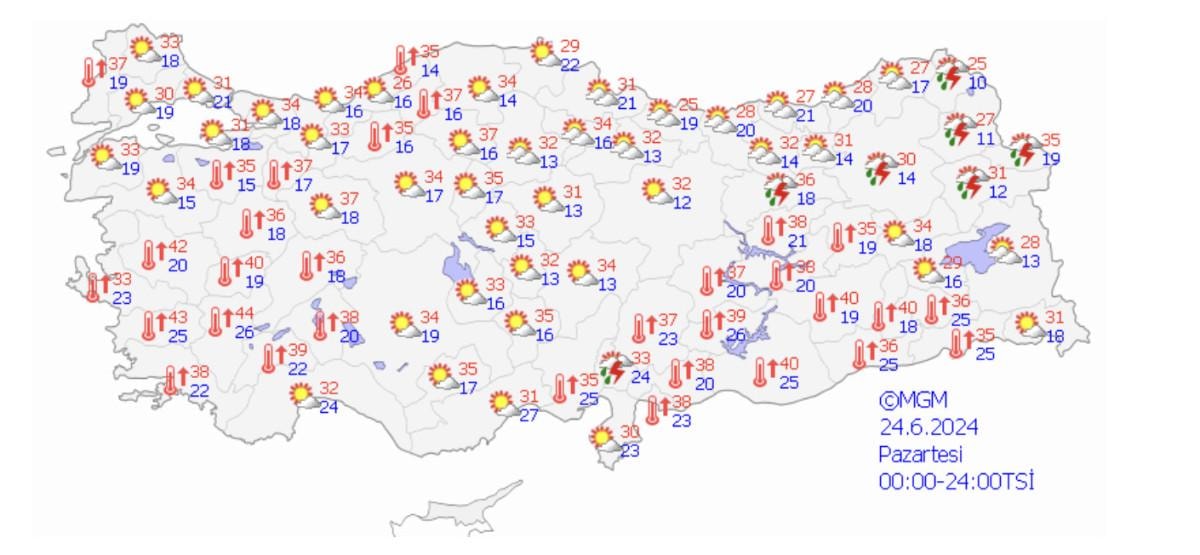 Ege'de sıcaklık çok yüksek gölgede Manisa 39, Muğla 40, Denizli 41, Aydın 43, Bodrum 37 derece.