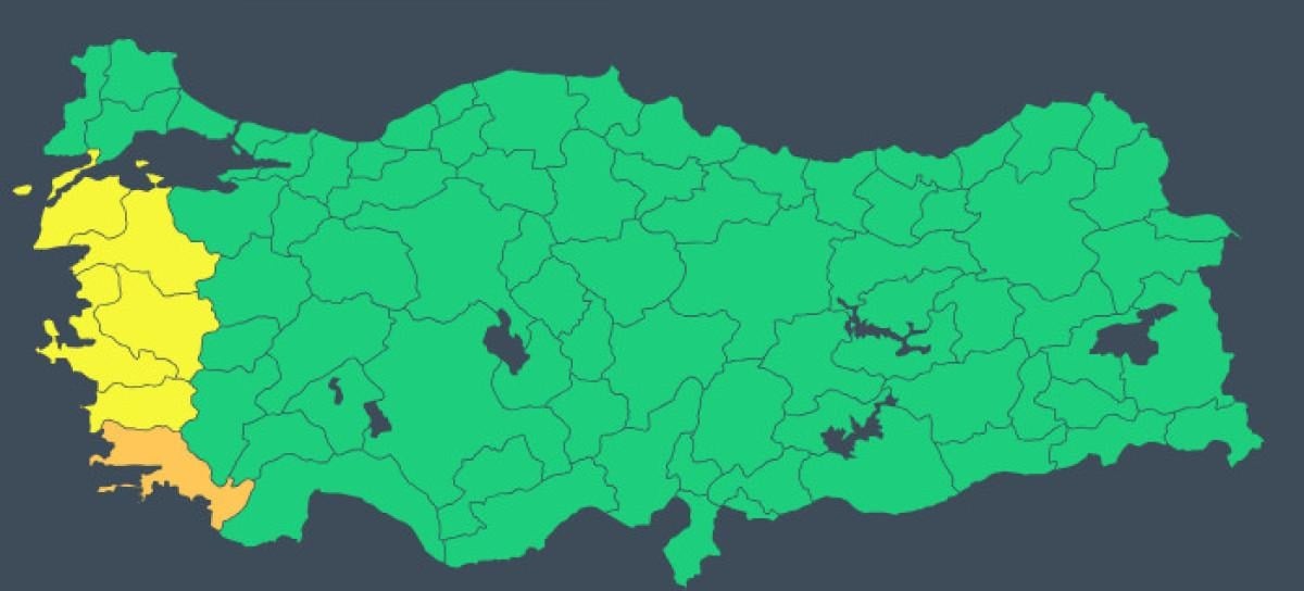 MGM tarafından sarı uyarı verilen iller Aydın, Çanakkale, Balıkesir, İzmir, Manisa olurken Muğla'ya ise turuncu kod verildi.